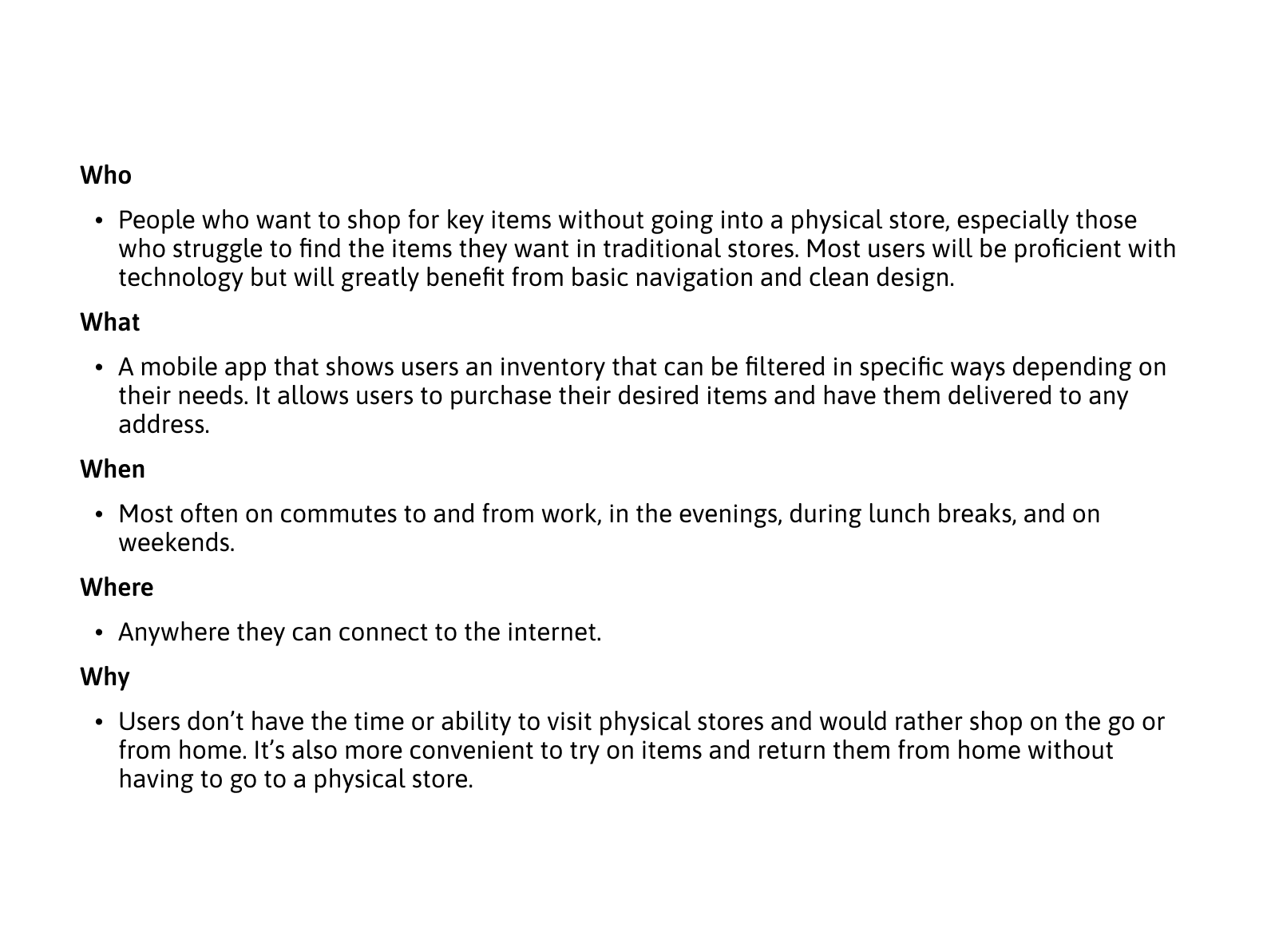I was provided with preliminary UX research that gave me a head start. A list of Five W’s, partial branding guidelines, and user story made it clear what issues I should address.